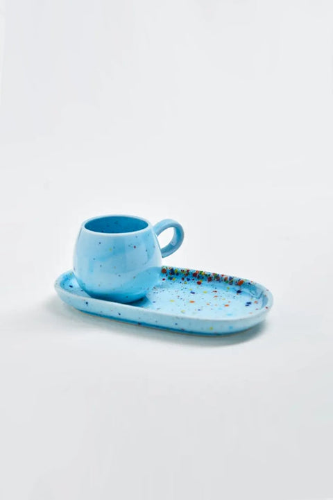 Ein Espresso Becher, der das gewisse Etwas hat! Der handgemachte Becher aus Keramik von Egg Back Home ist jedes Mal ein Unikat. Mit einer Höhe von 6 cm und seiner blauen Farbe und den bunten Sprenkeln ist er ideal für Deine Kaffeepause und Dein Lieblingsgetränk.