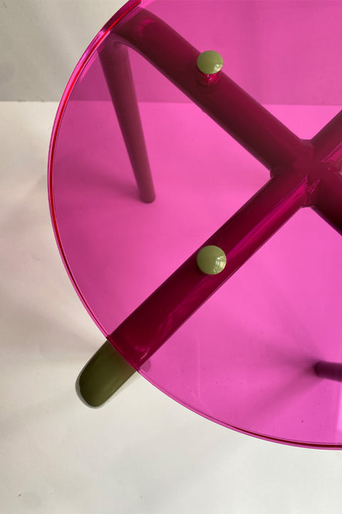 Erfrische dein Zuhause mit dem trendigen "Tabouret Pop" von Laurent Badier. Inspiriert von klassischen Schulstühlen, kombiniert dieser Hocker Acrylglas mit pulverbeschichteten Stahlbeinen für zeitgemäßen Stil und Robustheit. Die Sitzfläche in leuchtend Pink und die olivfarbenen Beine verleihen jedem Raum eine klassische Note. Genieße den Komfort und die Ästhetik dieses Designs, das perfekt zu modernen Wohnräumen passt.
